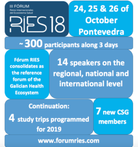 On the third day of the program of the III Forum RIES18, on Friday, October 26th, representatives of the more than 60 companies integrated in the Cluster Saúde de Galicia (CSG) and speakers of the III RIES18 Forum had the opportunity to meet in person SARAIVA SENIOR, Hifas da Terra and Gradiant in a day of visits to different entities that are part of the CSG.